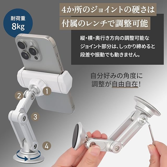 【可動域1080°+ジョイントの硬さ調節が可能】電話ホルダーのアームは4か所の角度調整の関節部分があり、1080°思い通りの角度をタテ·ヨコ·奥行に調整可能、横でも縦でもスマホを装着でき、最適な視野角を自由に調整できます。使わないときでも、折りたたんでコンパクトに収納でき、場所も取らず視界の邪魔にもなりません。さらにジョイントの硬さも自由自在!ジョイント部分はアルミのボルトで固定されており、付属の六角レンチでジョイントの硬さを任意に変更できます。少し緩めて自由に調節できるようにしたり、しっかり締めてどんな段差や振動でも動かないようにすることも可能です。