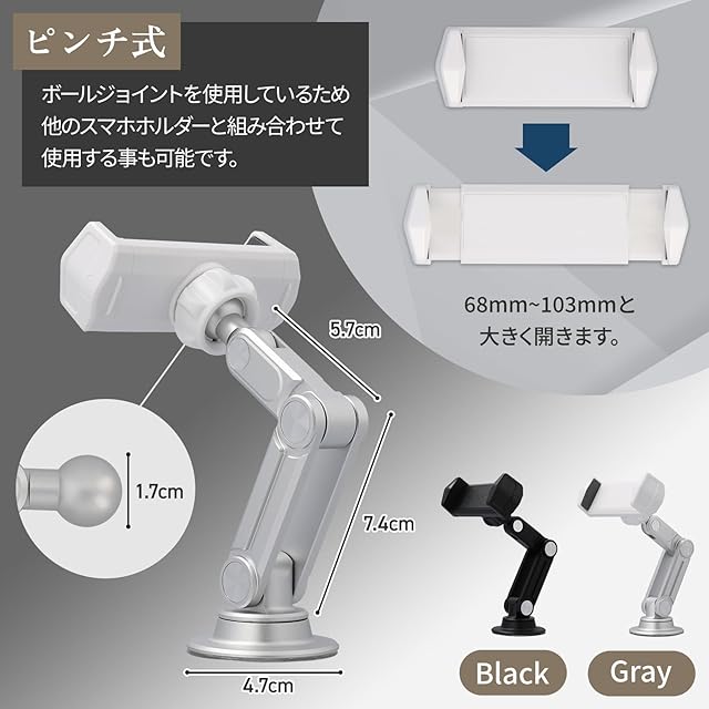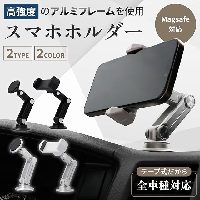 【2023年改良型】 車載スマホホルダー スマホホルダー スマホスタンド 携帯ホルダー スタンド マウント 粘着ゲル 車 車載 全車種対応 角度調整可能 無段階調節 多関節 アルミ アルミ削り出し アルミ合金 金属 360度回転 取付簡単 片手操作 安定性 ワンタッチ固定 Magsafe 2in1 iPhone/Android/Samsung/Galaxy など (マグネット式, ライトグレー)