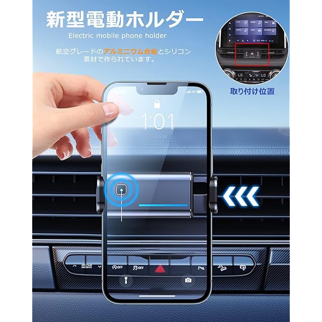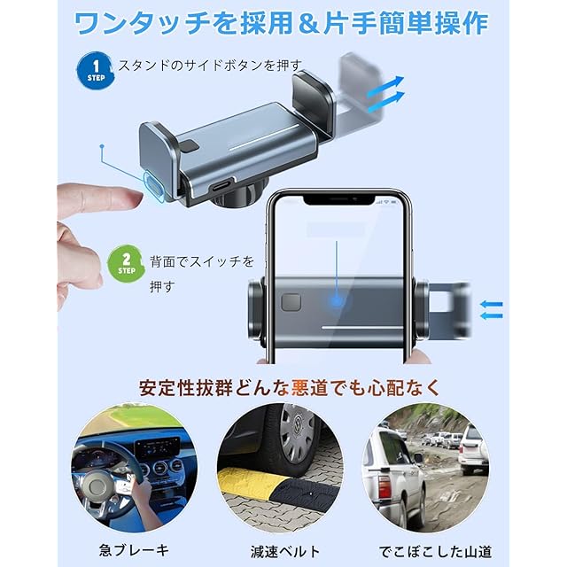 【片手操作&取付簡単】①スマホ取付け時:指で車載スタンドサイドのボタンを押すと、クランプアームが自動的に開きます。②スマホの背面でタッチボタンを押し込むことで固定アームが閉じ、しっかりと固定します。独特のつや消し加工がなされており、見栄えの良さと高級感を兼ね備えています。長時間(3ヶ月以上)使えない場合は、スリープ状態になるため、再利用する時24時間充電するのは必要です。また、製品に関してなにか問題ありましたら、お気軽にご連絡ください。