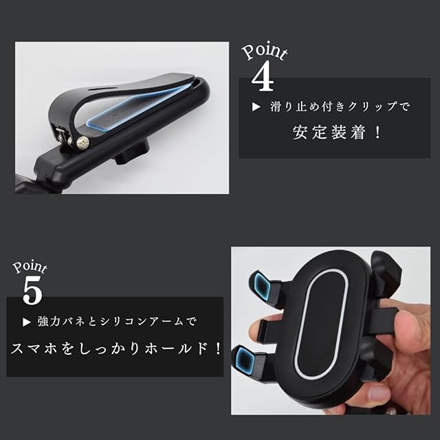 【安定感もバッチリ】クリップ部の滑り止めパッド、スマホを装着部にも4つ爪のパットと2本のスプリングでスマホをガッチリホールド!安定感も抜群です。