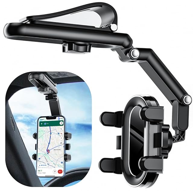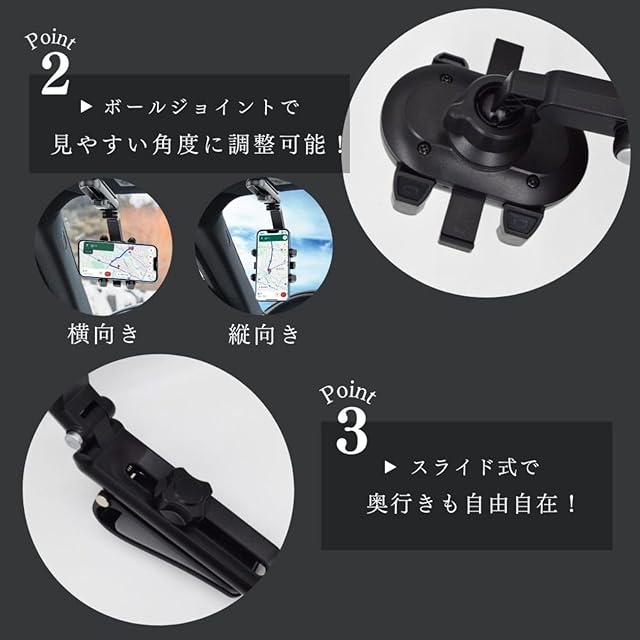 【自由自在の角度調整】クリップ部の長さ・角度、アーム部も2箇所の角度調整、スマホ装着部も360度調整可能!ドライバーの視界に最適なポジションでご利用下さい!