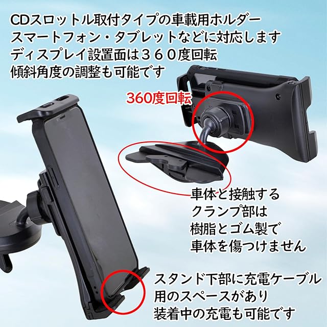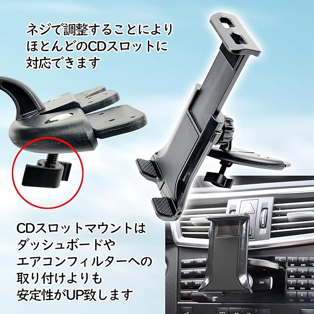 タブレットホルダー 車 用はスマホホルダー CDスロットに取付けるタイプのタブレット 車載 用となります。タブレットフォルダーはスマートフォン・タブレットipad ホルダー 車 用に対応いたします。 ディスプレー設置面は360度回転し傾斜角度の調整も可能です。