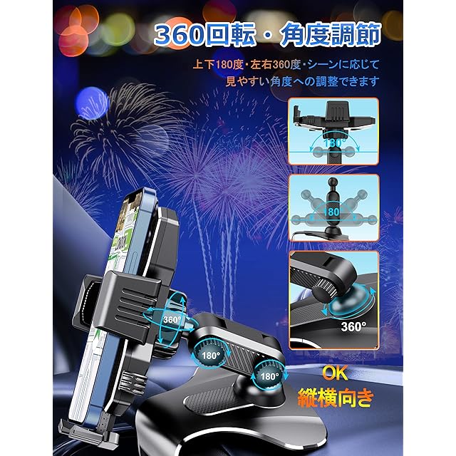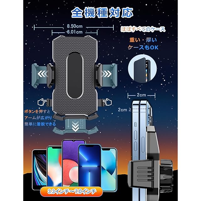 【多機能スマホホルダー・手帳型ケース対応・充電しながら使用可】★①取付けるスマホの大きさに合わせて受けアームをゆるめて引き開け、8段階で調節でき、4~7インチのスマホ対応できます。★②サイドアームの厚さは0.8インチ(約2.01cm)で、手帳型ケースでもてがっちり固定できます。③携帯ホルダーが充電部に干渉しないため充電しながらの使用も問題なく、ロングドライブも安心です。(ご注意:ワイヤレス充電機能対応できません。)④★多機種スマホ対応:4~7インチまですべての機種に対応できます。