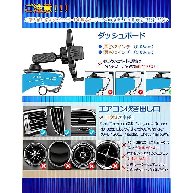 【ご注意・対応車種!!】スマホホルダー 車★①エアコン吹き出し口対応のクリップ:エアコン吹き出し・不定形の丸型形状の内側に羽があり、クリップを上手く挿すことができないため、不定形の丸型エアコンが対応できません。★②ダッシュボード対応のクリップ:強力バネ式のクリップなので、最大の幅は2インチ(約5.08cm)です。「厚さ<2インチ、深さ>2インチ」のダッシュボードが対応しかできません。もしダッシュボードの厚さは2インチ以上の場合、車用ホルダーをがっちり固定できません。★③対応できるかどうか、ご購入前に必ず、商品ページに詳細までご確認ください。