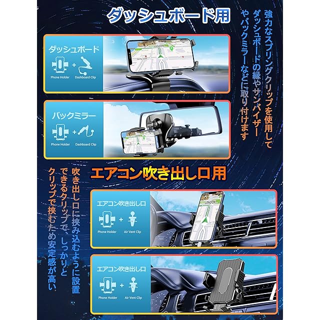 【ダッシュボード用・エアコン吹き出し口用】2WAY設定可の車用スマホホルダー:★①強力なスプリングクリップを使用して、ダッシュボードの縁やサンバイザーやバックミラーなどに取り付けます。★②エアコン吹き出し口に挟み込むように設置できるクリップが付き、しっかりとクリップで挟むため安定感が高いです。★③クリップ式車載ホルダーで簡単に取り外しできるので、別の車に取り付けたりするなど、取り外しを頻繁にする方にもおすすめ!★④2WAYで使える車スマホスタンド、視界の邪魔にならず運転席から見やすい場所に設置でき、運転中のカーナビ代わりとしても最適です~