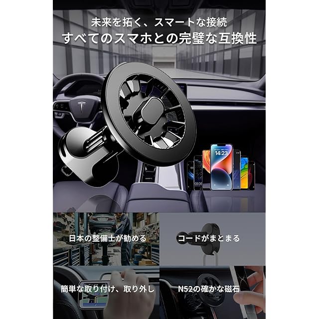 ✅【全端末への互換性】 MagSafe対応で最新のiPhone12シリーズ以降のモデルに対応し、付属のメタルリングによりiPhone11以前やAndroid端末も使用可能なこのカーナビホルダーは、未来のスマートフォンにも適応します。あらゆるデバイスを安定的に支え、ドライブを快適にします。 ✅【信頼の取り付け設計】 このホルダーはエアコン吹き出し口に確実に固定でき、N52の磁力で落下など他の製品で見られるような点を改善しました。自動車整備士にも推奨されるほどの信頼性を備えており、どんな車の環境でも安心してご使用いただけます。 ✅【スタイリッシュなデザインと高機能性】 O型ベースとターボリングを採用したこのホルダーは、スタイリッシュなブラックのプラスチック材質で、耐久性も兼ね備えています。どんな車のインテリアにもマッチし、機能性とデザイン性を高い次元で融合させています。 ✅【素早い取り付け・取り外し】 マグネット式で瞬時にスマホを装着・取り外しできるため、運転中の操作も安全かつスムーズです。車の中でスマートフォンを手間なく利用できるように設計されています。
