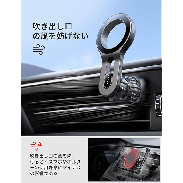 【圧接式型磁気リング&ワイヤレス充電】従来の磁気リングとは異なり、スマホホルダー マグネット は前例のない圧接式磁気リングを採用しており、昔ながらの粘着式磁気リングに別れを告げ、磁気リングが外れて携帯電話を傷つける心配がありません。スマホホルダー マグネットはワイヤレス充電に影響しません。 市場にある昔ながらのかさばる丸いケーキの形スマホホルダー マグネットとは異なり、lisen magsafe 車載ホルダーはくぼみのあるマグネットリングデザインを採用し、エアコンの風の正常な流れを確保します。