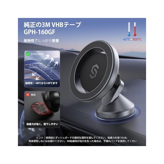 3M製強力両面テープ搭載:車のダッシュボードにスマホホルダーをしっかりと接着可能。使用温度の範囲がマイナス40度~プラス149度まで。極寒でも夏場の暑い車内でも、余裕のある設定可能です。走行中の振動にも強い。