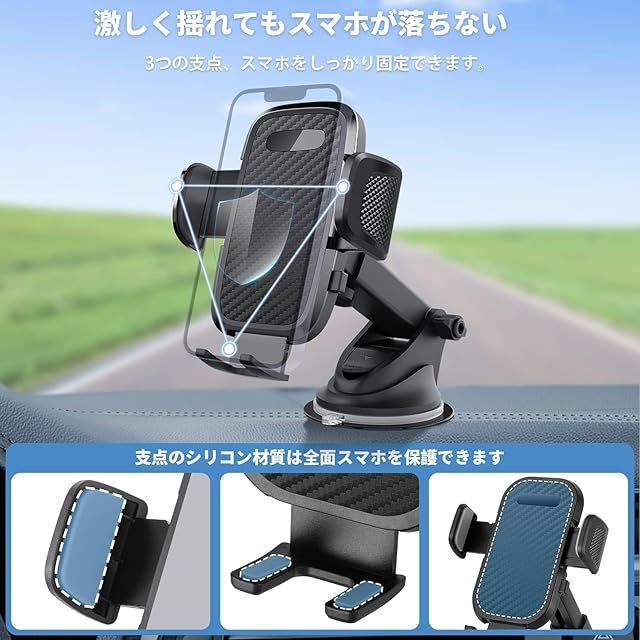 【超強力真空吸盤&安定性拔群】スマホスタンドは高品質なシリカゲルを使用し、最大限に安定性を向上させて、急ブレーキやデコボコ道でも取れる心配はありません。吸盤には耐熱成分が追加されており、夏場に外れやすいという問題を完璧に解決し、車の表面の革を傷つけず、跡も残らないので、安心感と快適さを提供します。付属の超粘着性のある吸盤補助シートで、多少湾曲したり、シボのあるダッシュボードにも問題なく吸盤を設置できます。また、携帯ホルダーは超安定な三角構造を採用した上に、サイド固定と下側固定もクッション材料を使用して、耐震性が良くて普通の車載ホルダーよりしっかりとスマホをホールドします。