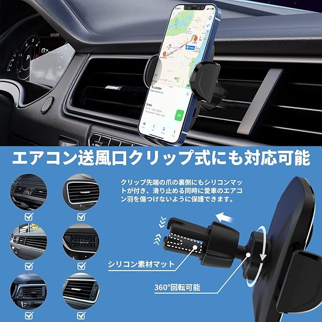 【安定性抜群・激しく揺れても落ちない】車携帯ホルダーのアームはホールド力がアップ、下支点と安定した三角構造を成形し、しっかりスマホを固定できます。アームも下支点もの裏面に柔らかいシリコン素材を採用しているので、滑り止めと同時にスマホを最大限に保護できます。クリップ先端の爪の裏側にもシリコンマットが付き、エアコン羽をしっかり挟める時に傷つけないように保護します。