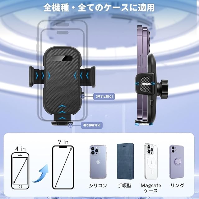 【全機種対応】車用スマホホルダー は幅広く互換性を備え、iPhone 13 / iPhone 12 / iPhone 11 / 11 Pro / XR / iPhone X / XS / XS MAX / iPhone 8 Plus / 8 / SE / SE 2 / 7 Plus / 7 / 6 Plus / 6、または Galaxy S8 / S8 Plus / huawei / Xiao Mi / Xperia / Google Pixelなど4-7インチ大画面のスマホに対応可能 、および手帳型ケース 、スマホ ケース, シリコーン, クリア(全透明), ゴム, レザーなど様々な厚みや機種に対応できます。