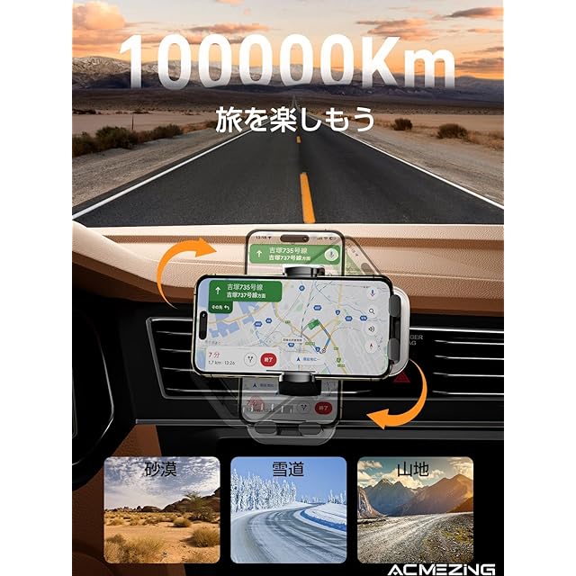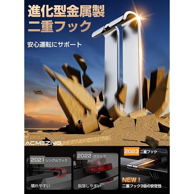 【スマホホルダー 車·業界初デザイン·落下する可能性は0%!】長年にわたり販売数No.1カー用品日本業界のリーダーとして、ACMEZINGは数年間、車 スマホスタンドの研究開発に力を注ぎ、車用品に関する何千もの市場調査やお客様の声をもとに、日本のドライバーに最も適した「金属製二重フック+伸縮性透明つや消しアクリル製パネル」車載ホルダーを開発しました。従来のエアコン吹き出し口単一フック式とクリップ式は異なり、二重フック式、ダブル3角構造で、3倍以上の安定性、揺らない、落ちない、異音なし、ガッチリエアコン吹き出し口に固定できます。100%落ちません!安定感抜群!二重フック構成のユニークなスナップ調整により、吹き出し口のブレードがたるむのを防ぎ、エアコンの風を正しい方向へ確実に送ります。また、高品質な航空機用材料が採用され、耐久性が普通より50倍強くなります。市販の伸縮できない半透明モデルとは異なり、半透明フロスト加工された質感、伸縮機能を持たせカバー、より幅広い携帯電話のサイズに対応、他にはない車内の仕上げにアップグレードしました! 見逃すわけにはいきません!