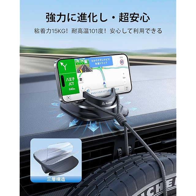 【粘着力15KG、高温に耐える超強力粘着パット】あなたの安全はAndobilが第一にしております。安心運転の為に、Andobilのプロダクトマネージャーが3年間掛けて、様々な粘着剤を試して、各種の道路考察を経て、ようやく最強型の粘着パットの開発に成功しました。Andobilが新開発した特殊粘着パットは強力な吸着力と高温でもヘタらない耐久力を実現できました。3層構造の強力粘着パットは「耐荷重15KG」で一般製品より、粘着力が高くなり、エンジンの振動やデコボコ道でも取れる心配はありません。また、真夏でパットが取れる問題を解決し、跡も残らなくて、安心感と快適さをあなたに提供します。更に、パットが繰り返し使用可能で、例え最初の取付位置がダメでも、外して再度取付できて、ストレスなくご利用いただけます。この商品は社用車やレンタカーやシェアカーのドライバーに愛用されていて、他社製品と圧倒的な違いを是非とも体感してください。