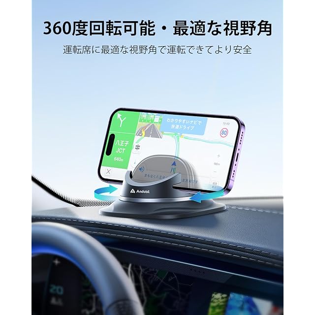 【運転手に大好評なより便利な角度調整機能】市販の製品にある角度調整の角度が30度しかできない制限の問題に対して、Andobilの車載スマホホルダーが最大45度調整可能で、日光反射によるスマホ画面視認性低下の問題を解消し、もっと快適にスマホを利用できます。また、市販の製品にあるベースの回転しずらい問題に対して、Andobilはベースの回転構造を弊社独自開発の歯車構造に改良して、一発でドライブに最適角度が極まれます。そして、コンパクト設計で軽自動車の狭いダッシュボードにもすっきり収まり、運転視界を妨げません。更に、Andobilのスマホスタンド 車は外見がデザインされていて、使わない時が目立たず、ご愛車のインテリアとしても可能です。