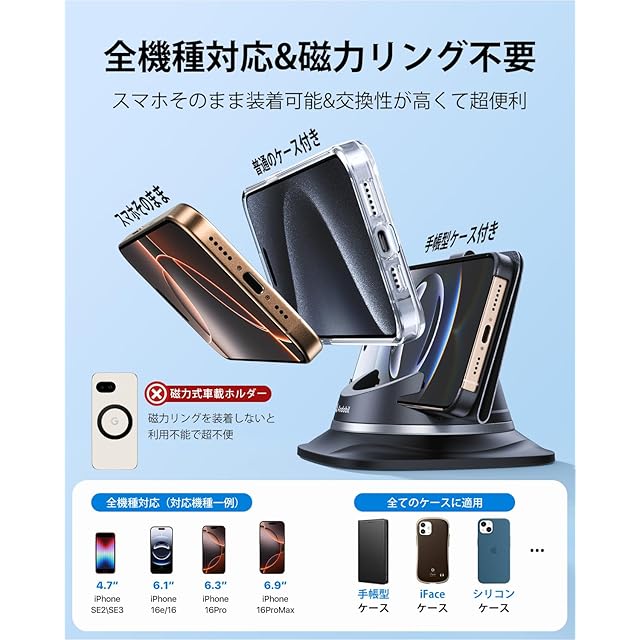 【取付が超簡単&全車種に適応】スマホの取り付けが、普通型の車載ホルダーのように、クランプアームで固定する必要がなく、マグネット式車載ホルダーのように磁力で吸着位置を合わせる必要もなく、スマホを置くだけでスマホの取り付けも完了になります。車載ホルダーの取り付けが吸盤式や送風口式車載ホルダーのように、製品を組み立てる必要がなく、製品をダッシュポートに取り付けたい時は、製品のベースにあるフィルムを剝がして、置けば取り付けが完了になります。そして、製品には特殊な粘着パットが搭載していますので、NBOX、VN系レヴォーグ、軽自動車を含めて、全車種に適応しています。ご注意:①湾曲している所に製品の取付が控えてください。②製品のベースのサイズが10cm*10cmであることが予めご了承ください。