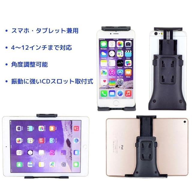 【使用方法】自動車のCDスロットに取り付けるタイプの車載ホルダーで、お使いのタブレットやスマートフォンを固定できるスタンドです。 伸縮式のホルダーで、4~12インチ型のタブレットやスマホ、iPhone、iPad、Android端末などを道具なしで簡単に脱着できます。 また、落下防止のロック機能でホルダーをCDスロットにしっかりと固定できるため、運転中のブレーキや険しい山道で揺れや振動があっても影響しにくい設計となっております。 ジョイント部分が360度自由自在なので角度調整が簡単に行うことができ、スマートフォンを縦置きでも横置きでもご利用いただけますので、ナビやほかのアプリを安全に操作する時に便利です。 また、クッションのあるグリップでタブレットを固定するので傷をつける心配がありません。GPSナビゲーションなどを見るのに是非お試しください。 取り付けにはCDスロット上部に2cm、下部に4cmのスペースが必要です。 差し込みに問題がある時は上下逆向きでの装着をお試し下さい。