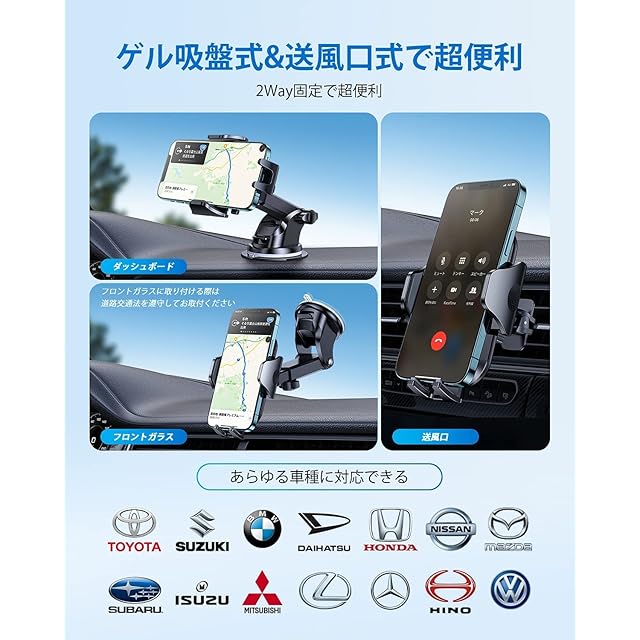 【改良型、より使いやすい車載ホルダー・プレゼントに最適】Andobilは車載ホルダーの専門店として、欧米、日本の500,000+のお客様のフィードバッグ、5,000+回の試験と40種類道路状況の考察を通じて、3年間経って、ようやく業界をリードする車載ホルダーを開発できました。「吸盤式&送風口式両用で超便利」Andobilが改良された車 スマホホルダーは吹き出し口式だけではなく、ゲル吸盤式ホルダーとしてダッシュボード、フロントガラスに装着してご使用頂けます。「取付簡単でプレゼントに最適」初心者でもすぐ使いこなせるように、車への取り付けがとても簡単です。すまほほるだーはワンタッチで使用できて操作性も抜群です。また、本製品は梱包に加え、細部まで拘ってデザインされ、全体的に高級感が溢れています。安全な運転環境を作り、大変実用性有るので、温かいプレゼントとしては喜ばせていただきます。