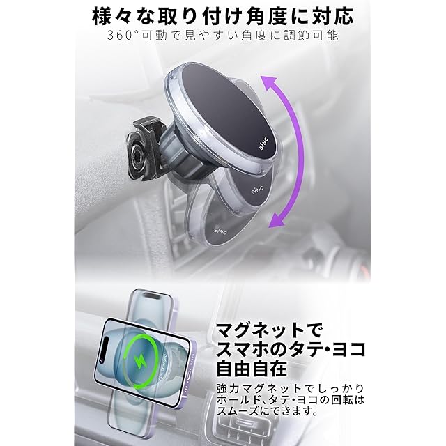 車載に最適、瞬間装着とワイヤレス充電。ネオジム磁石でスマホをホールドしながら無線充電可能なマグネットワイヤレスホルダーです。MagSafe機能付き機種対応