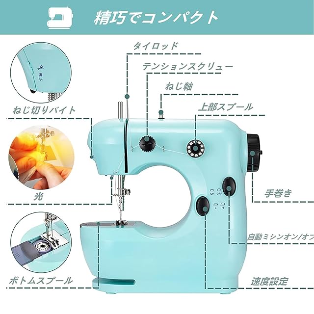 ミシン ハンドミシン 初心者向け 人気 日本製 ハンディ 複線裁縫 コンパクトスピード調整可能 LED小型 Cotumned Sewing Machine 筒縫 電子電動ロック コンパクト便利 操作簡単 日常手作り縫製 sewing machinesホームミニ シアン