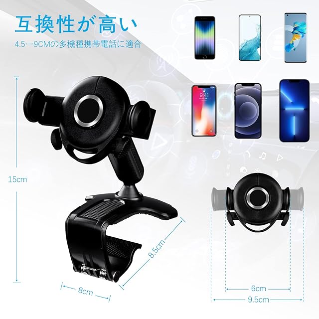 【新しく改良されたクリップ式カーホルダー】あらゆる車種に対応するスマートフォンカーホルダーで、i-Phone13/ i-Phone12/11/X/XS/S-ony/Sam-sung/HUA-WEI I/One-plus/SAM-SUNG Ga-laxyなどの4.5〜9センチのスマートフォンに対応しています。(注意:適用車種のダッシュボード幅は2インチ以下です。ご購入前にダッシュボードの幅と奥行きを確認し、正しい商品サイズをご注文ください)