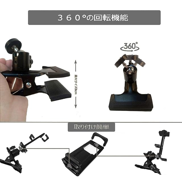 【高品質のクリップ式】:クリップ式車載ホルダーは強力ばねを採用され、吸盤や粘着タイプのように外れやすいことがなく、しっかり固定できます。ネジ部分はギアが設けられ、滑りなくちゃんとロッキング可能。クリップ部分は50mmまで厚さのまでの物にしっかりと挟むことが可能です。安定性抜群で車の振動でも落ちることはないです。