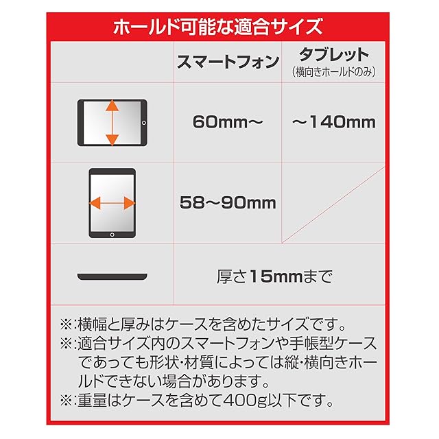 【収納サイズ】スマートフォンの縦置き/横置き、8インチまでのタブレットの横置きが可能。縦置き58〜90mm、横置き69〜140mm、奥行き12mm以下。