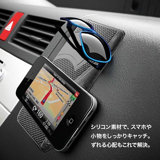 【車載用のスマホ吸着シート】吸いつくようにスマホを固定するシリコン素材の粘着シート。ダッシュボードに取り付けて、サングラスや鍵など小物もがっちり貼り付き、ずれません。