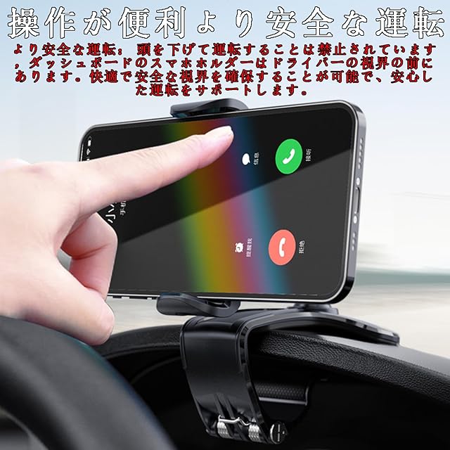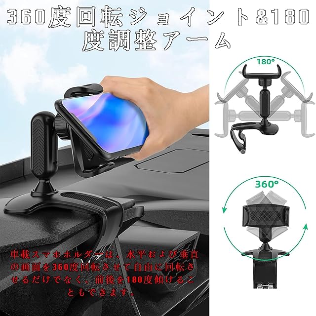 【新改良のクリップ式車載ホルダー】視野を確保:運転中に視界をそらす必要がないため、GPSを使用したり話したりするときに無制限の視野を確保できます。より安全な運転: 頭を下げて運転することは禁止されています,ダッシュボードのスマホホルダーはドライバーの視界の前にあります。快適で安全な視界を確保することが可能で、安心した運転をサポートします。 【 安定感抜群】車載スマホホルダーの耐久性に優れたスプリングクリップ装着設計により、どこにでもしっかりと取り付けられます。 スマホホルダーのに滑り止めシリコンがついているので、大切なスマホをしっかりホールドできます。アームの接触面にはソフトシリコン製の滑り止めゴムが付き、愛車に傷つけるおそれがないです。 悪路を走行しても落ちるない。 【片手操作&任意の角度に調整】片手で簡単に取り付け・分解が。車載スマホホルダーは、水平および垂直の画面を360度回転させて自由に回転させるだけでなく、前後を180度傾けることもできます。電話を必要な方向に簡単に回転させて、干渉しないようにすることができます。使わないときでも、折りたたんでコンパクトに収納でき、場所を取らない。 【幅広い互換性】車載ホルダーとして車内のダッシュボード、サンバイザー、バックミラ—はもちろん、 普通のスマホホルダーとしても寝室、オフィスなど多場所に取り付けることができます。幅広く4.7~6.5インチのスマホに適用。GPSナビゲーション、天気予報、音楽、交通情報など、スマホの便利な機能をすべて利用でき。 【高品質な素材&耐久性】ABS樹脂素材を使用し、耐熱性、安全性、耐久性、お手入れが簡単、-40〜100℃の温度に耐え、高温暴露による変形がありません。夏でも冬でも便利に使えます。製品に問題が発生した場合は、運送途中での箱潰れ、付属品不足、商品破損、初期不良が発生した場合、全額返金または無料で商品交換を対応し、お客様のニーズに合わせ、24時間以内に返事致します。
