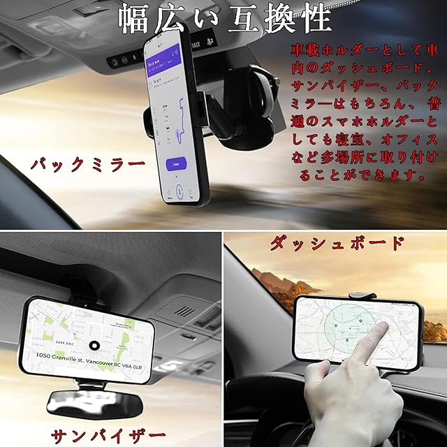 【幅広い互換性】車載ホルダーとして車内のダッシュボード、サンバイザー、バックミラ—はもちろん、 普通のスマホホルダーとしても寝室、オフィスなど多場所に取り付けることができます。幅広く4.7~6.5インチのスマホに適用。GPSナビゲーション、天気予報、音楽、交通情報など、スマホの便利な機能をすべて利用でき。