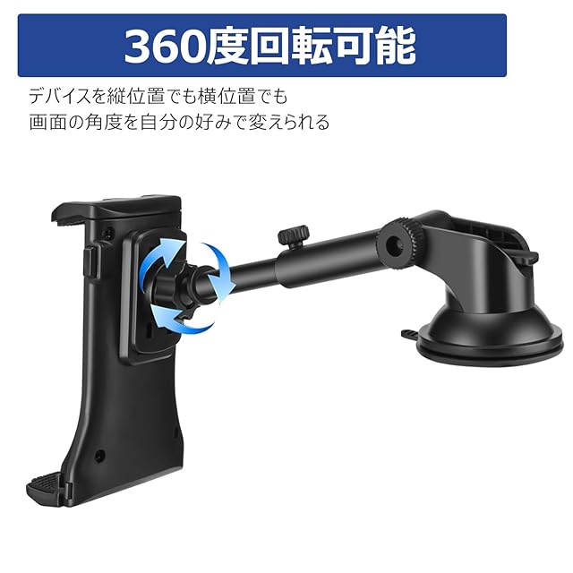 【タブレットとスマホ両方使える】本製品はタブレット&スマホ両用の吸盤式車載ホルダーで、ナビアプリケーションをインストールし、iPadを運転席でナビ代わりにして、もっと大きい画面でナビができます。 【強力な粘着ゲル吸盤】高品質のゲル吸盤で、多少凹凸のあるところにしっかり固定できるようになりました、または車内に跡が残ることはない!運転中、落ちる心配もありません。 【伸縮アーム機能】伸縮するアーム機能で、最適な視野角を調整できます。下部の支えは移動できるので、各型番のスマホとタブレットの充電ポートを遮らないです!最大5cm伸縮するアーム機能で抜群の視認性を実現。完璧な視野角を確保します。 【360度回転可能】最大360度回転するボールジョイントを採用、デバイスを縦位置でも横位置でもご利用いただけ、画面の角度を自分の好みで変えられて取り付けます。 【4~10.5インチに適用 】幅広く4~10.5インチのスマホとタブレットに適用します。 デバイス+ケースも全然OK。