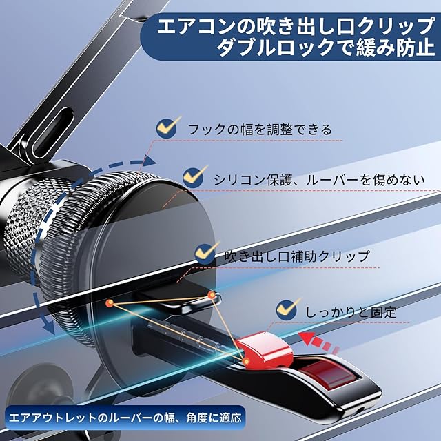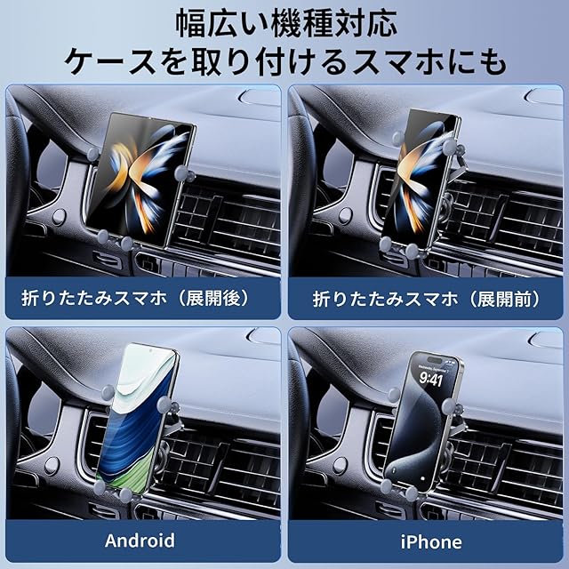 【折りたたみスマホ対応 】スマホホルダー 車 車載ホルダー 重力式 エアコン吹き出し口 横折りスマホ対応 タブレット対応不可 折りたたみ展開 片手操作 回転可能 自由調節 手帳型ケース対応