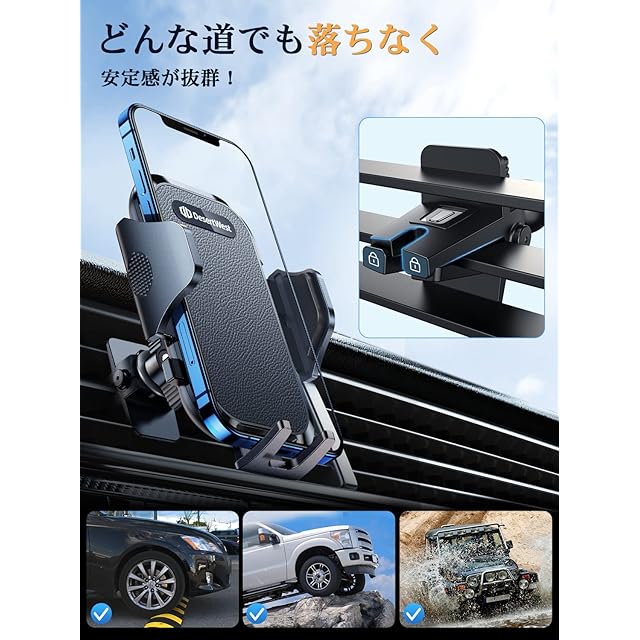 【革新な合金補強クリップ&安心運転にサポート】6年間経って、DesertWest 車載スマホホルダーはようやく最強な螺旋クリップを開発できました。折れやすいプラスチック製のクリップと比べて、当社スマホスタンド 車のクリップはアルミ合金と高品質なテフロン樹脂を使用して、耐久性が普通より50倍強くなります。また、2023改良設計な螺旋クリップで、エアコン吹き出口の厚みによって、クリップのネジが調節を可能ので、ルーバー(羽)をしっかり固定できます。さらに、クリップの接触部分にはシリコンパッドが搭載されており、滑りにくく安定性は最高!どんな激しい悪路でも、スマートフォンが落ちる心配はありません。