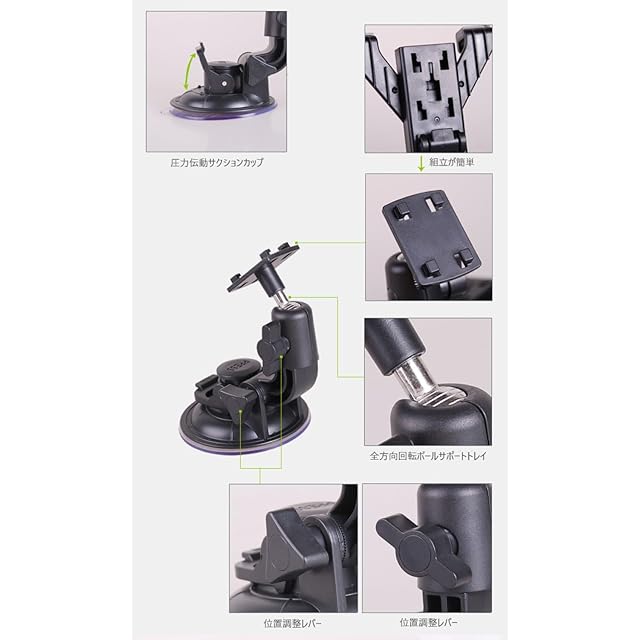*ご注意:重要!取付が粘着ゲル+真空吸盤で取り付ける為、取り付ける下地が皮革(レザー)、角度のキツイ湾曲部分、段差、溝の部分、凹凸が激しい部分で吸盤が真空状態に出来ない所ではご使用が出来ません。 ※吸盤サイズが9㎝あるので9㎝以上の平らな面をお探しください。