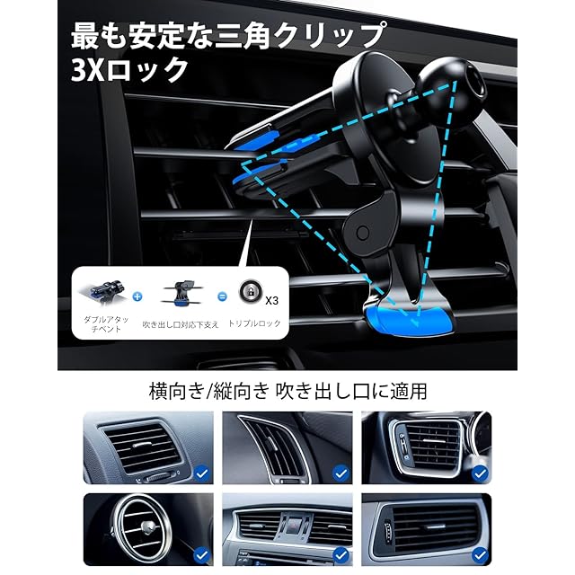 運転安全は運転中一番大事なこと、車載スマホホルダーはスマートセンシング設定と特殊な三角クリップによるどんな荒れた道でもスマホしっかり固定!航空機用アルミ合金製クリップと特殊な下支え耐久性がより30倍強化し、三角は頂点に力が加わっても左右に力が分散され、安定性を保つことができ、運転中スマホが落ちるごとが心配なしドライブに集中でき、安全運転にサポート。三角クリップに柔軟なシリコンが付き、しっかり固定の同時にご愛車の吹き出し口を傷つけません、クリップ部は360°自由に調節が可能、横、縦吹き出し口とも自由に取り付けでき、 BMW/トヨタ/三菱/鈴木/本田/マツダ/スバル多くの車種の吹き出し口に適用。