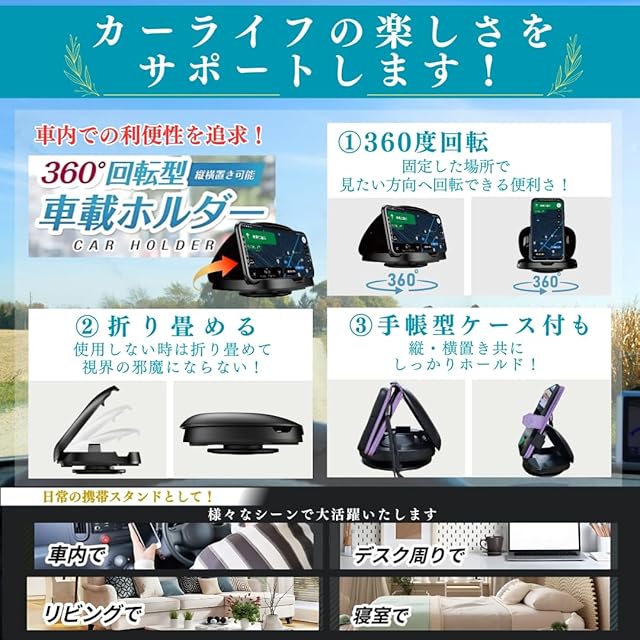【多用途利用】車内だけでなく、デスクやキッチンでも活躍。レシピ確認や動画視聴が快適に行え、日常生活をより便利にします。