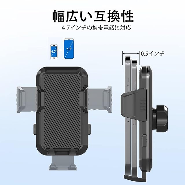 【4~7インチの携帯電話に対応・充電可能ホール付】 4-7インチの携帯電話、スマホに対応できます。Apple iPhone 14 /14 Plus /14 Pro /14 Pro Max /13 /13 Mini /13 Pro /13 Pro Max /12 Pro Max /12 Pro /12 /12 Mini /11 Pro Max /11 Pro /11 / XS Max / XR / X / 8 Plus/ 8 / 7 Plus / 7 /SE 3 /SE 2 または SAMSUNG / Sony / Huawei / Google Pixelなど。これ1台であればどちらのデバイスにも利用できるのでとても便利です。この車載用ホルダーは充電可能ホールが付きます。充電しながらご利用いただけます。