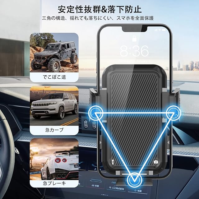 【100%落ちにくい・安定性アップ】 超安定な三角構造を採用した上に、調節可能な下支えと強力なアームを搭載して、また、スマホホルダー本体に滑り止めシリコンが付き;重力、電動、磁石式ホルダーとは違い、車からの振動を吸収し、運転中にどんなにひどく揺れてもしっかりスマホを固定し、スマホが落下する心配はありません。