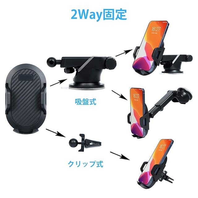 【2in1車載スマホホルダー】 粘着吸盤タイプ: 吸盤の透明フィルムを剥がして、 取り付けしたい位置に貼り付けてからロックレバーを下ろす。 吹き出し口タイプ: 取り付けはクリップでエアコンの通風口に取り付けるだけ。 面倒な組み立ても不要で誰でもすぐに取り付け・取り外しが可能。 移動が楽なため、 社用車やレンタカーなどへの取り付けもノンストレス。