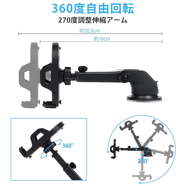 【360度自由回転&伸縮アーム】 この車載スマホホルダーは最大360度回転するボールジョイントを採用し、 横でも縦でもスマホを自由に操作できます。 伸縮するアーム機能で、 最適な視野角を調整でき、 運転に邪魔することもございません。