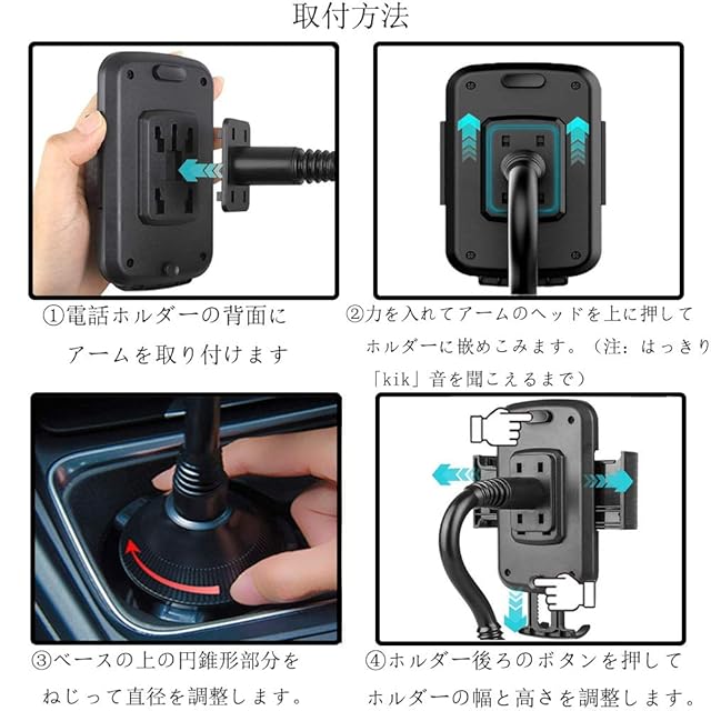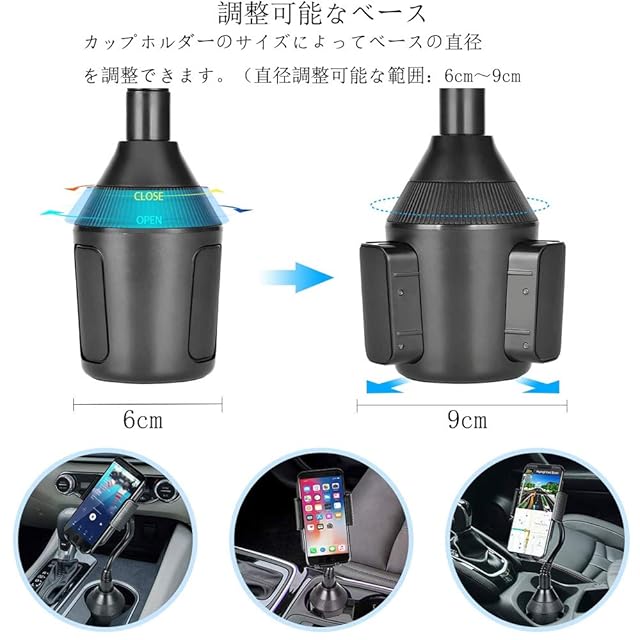 【カップ式車載ホルダーの利点】 1. ダッシュボードと窓をきれいに保ちます。 革新的なデザインのスマホホルダー電話マウントは、運転中に視界を妨げません。ダッシュボードや窓に何も取り付ける必要はありません。車のドリンクベースに置くだけで固定できます。 2.調節可能で丈夫なホルダー。 調節可能な重厚なホルダーベースと丈夫なプラスチック製で、携帯電話ホルダーはドリンクベースにしっかりと固定されます。