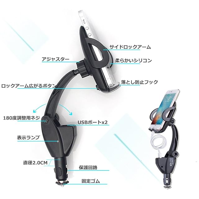 シガーソケット付、シガーソケット挿し、簡易に固定できて、USB端子もあるし、携帯に充電可能です。(DC12V/24V車に対応) zt