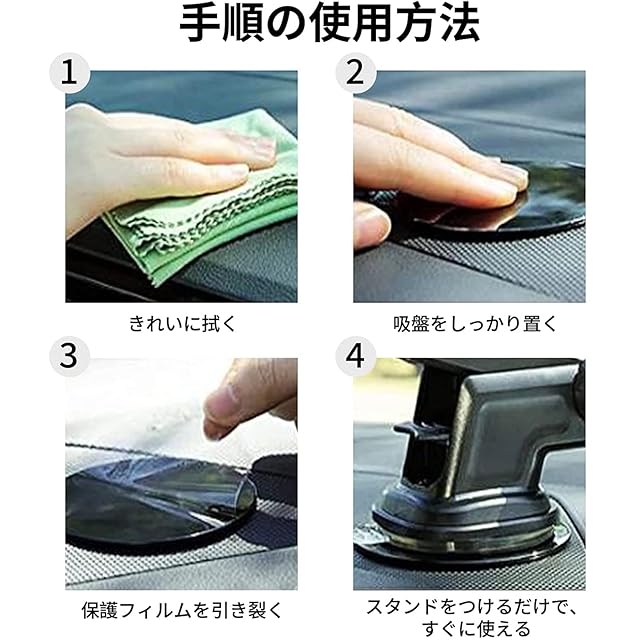 【高品質の素材】吸盤基台ベースは高品質なABS材質で作られ、優れた耐久性をもち、壊れにくくなっています。底面にはしっかりとした超強力接着剤いています。 超強力接着剤は、通常の接着剤よりも40%強力です。 この吸盤用ディスクはとても強い粘着力でダッシュボードにしっかりと取り付けできます。悪路でもスマホが滑る心配がなく安定した安全運転ができます。