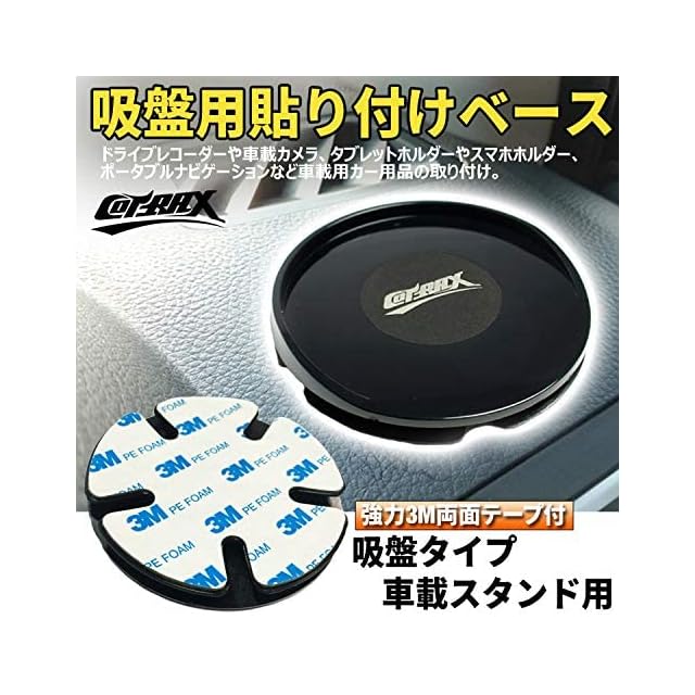 吸盤が取り付けにくいシボ面に取付!!<br> <br> スマートフォンやタブレット・ポータブルナビなどを取り付ける為の吸盤ステーをダッシュボードなどのシボ面に対応させる為のベースです。<br> 吸盤は平坦な面にしか取り付けできないためダッシュボードなどシボ加工された面には使用できません。当ベースをダッシュボードに貼り付けることで平滑な面が生まれ通常の吸盤ステーでも使用が可能になります。<br> ベース背面は強力な3M両面テープが貼り付けてあり、簡単に設置が可能です。<br> <br> ●商品基本情報・<br> 商品名:φ90mm吸盤ベース<br> 対 応:φ85mm以下 吸盤ステー<br> <br> ●取り付け方法<br> 1.ダッシュボードの取付面を脱脂します(油分を完全に拭き取ってください)<br> 2.曲面や取付面に合わせてシート粘着部を曲げておく<br> 3.シート接着部をドライヤー等で温めてから貼り付け、24時間以上放置させてから使用してください。<br>