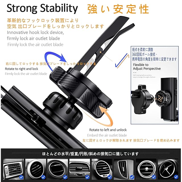 回転および傾斜機能: このホルダーには通常、携帯電話の角度を調整できる回転および傾斜機能が備わっており、異なる視野の要件に合わせて調整できます。これにより、運転者はナビゲーションアプリや他の重要な情報に簡単にアクセスでき、快適な運転姿勢を保つことができます。