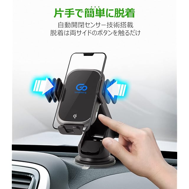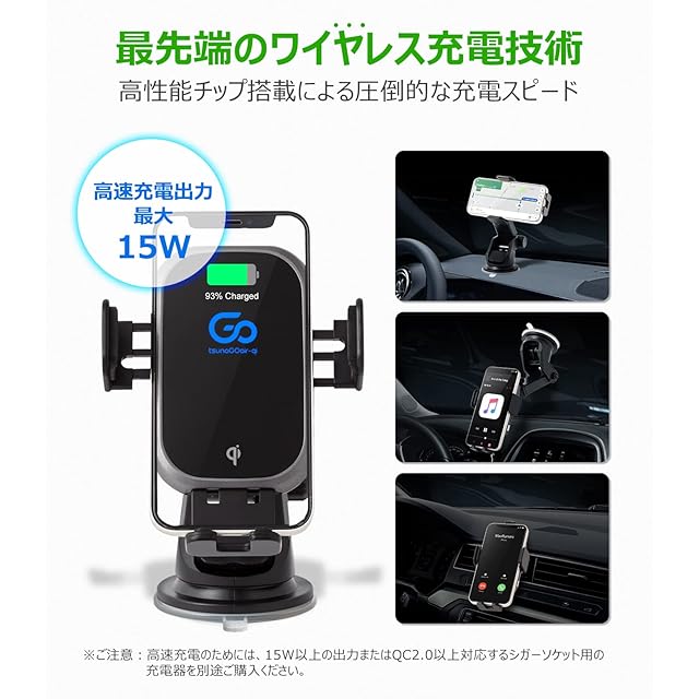 ツナゴーエアー 最大15W ワイヤレス高速充電 スマホホルダー 粘着ゲル吸盤・エアコン吹き出し口両用 360度回転 置くだけ充電 車載・デスク・テーブル・ダイニングなど付けたいところに簡単取付け tsunaGOair-qi【qi, PSE認証済み】 黒色
