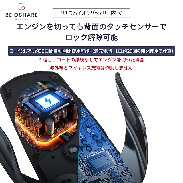 『エンジンを切っても使用可能』リチウムイオンバッテリーが内蔵されているため充電コードを接続せずにエンジンを切っても、背面のタッチセンサーでロックを解除することができます。(※充電コードを接続しない場合、赤外線センサーとワイヤレス充電機能は動作しません)バッテリーの持ちが良く、満充電の状態で1日に約20回の開閉を行うと、約1ヶ月間使用することができます。