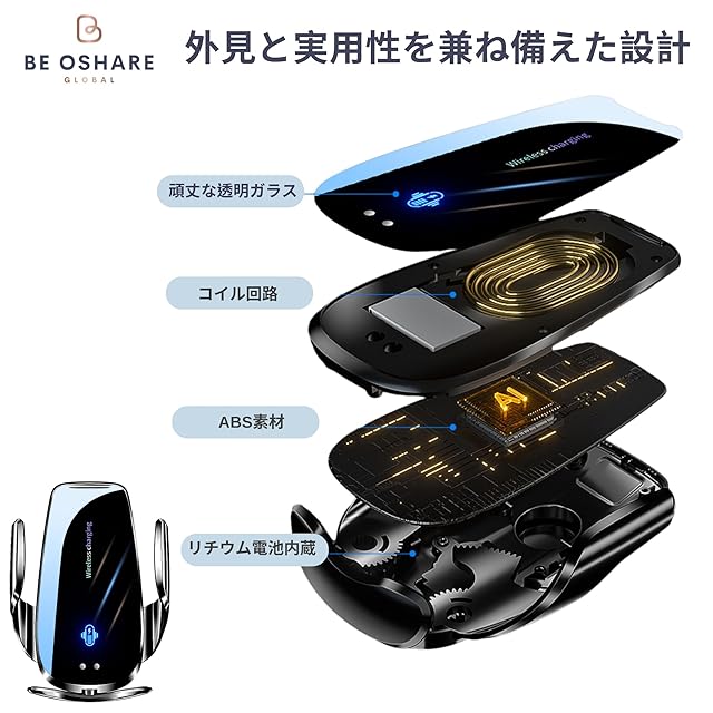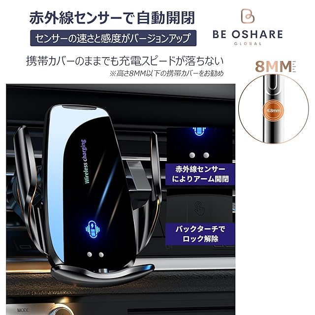 Be Oshare 車スマホホルダー 車載携帯ホルダー 吹き出し口フック付き ダッシュボードスタンド付き 15W ワイヤレス充電 バッテリー付き エンジン切っても使用可能 自動開閉 赤外線センサー 360度回転 片手操作 全携帯機種適用 付属品クリップ、コード、iphone, Android ,Type C用ヘッド付き 悪路でも安定 国際Qi認証 日本販売店 日本語サポート 日本語説明書付き