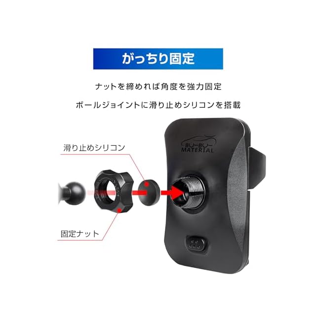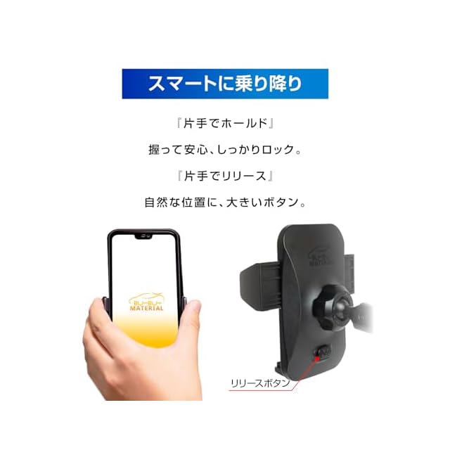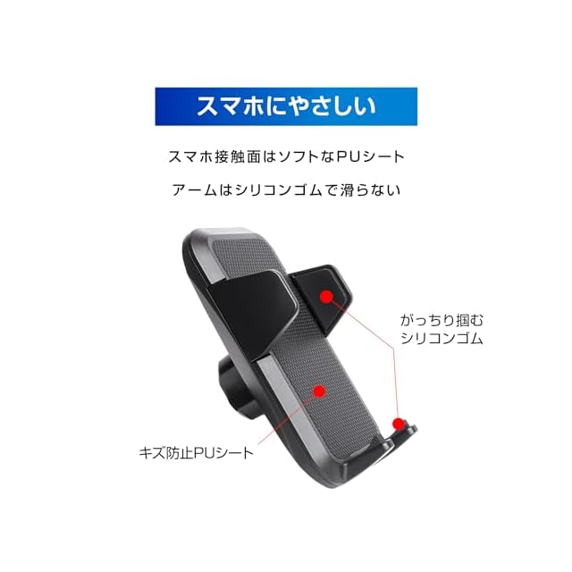 【スマホ固定】●スマホを固定するサイドアームは手帳型やリング付きの厚みにも対応。グリップの良いシリコンゴムでがっちり固定します。●片手で簡単。ホールド&リリース。スムーズなギアが品質の証。