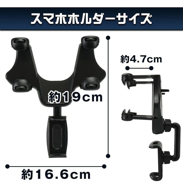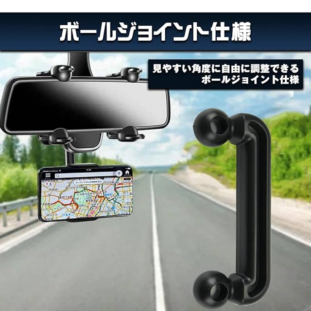 スマホを固定しているホルダーは360度回転ができるので、お好きな角度に固定ができます。スマホ部分とミラー取り付け部分も角度調節可能です。