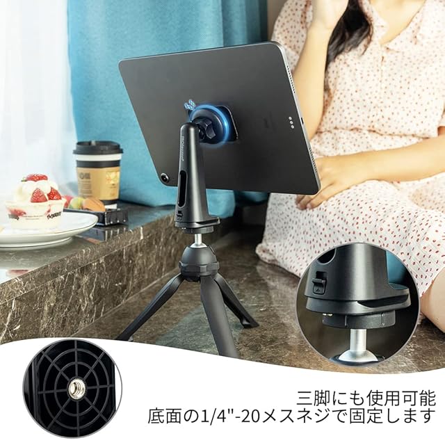 【 1/4ネジ穴&アルカスイス対応互換】スマホ/タブレットスタンド底部には1/4''-20ネジ穴とArca-Swissのクイックリリースプレートで設計されており、ほとんどの三脚/一脚/スタビライザーなどに対応し、アルカスイス互換の機器に素早く取り付けることもできます。